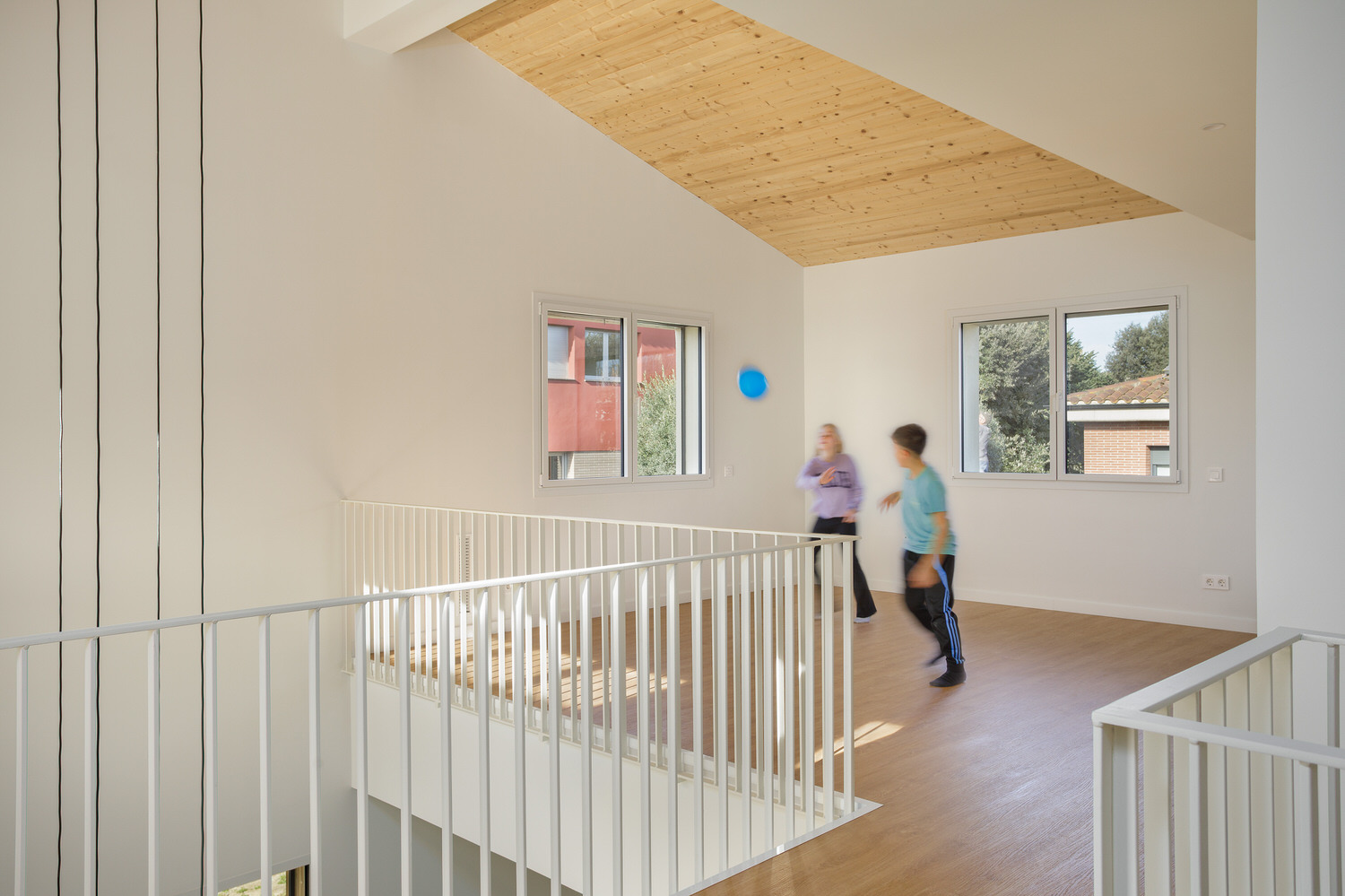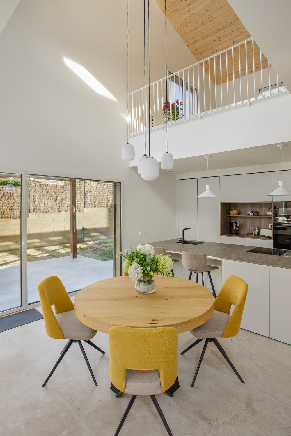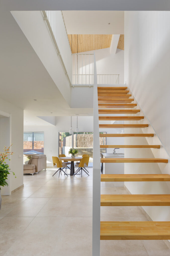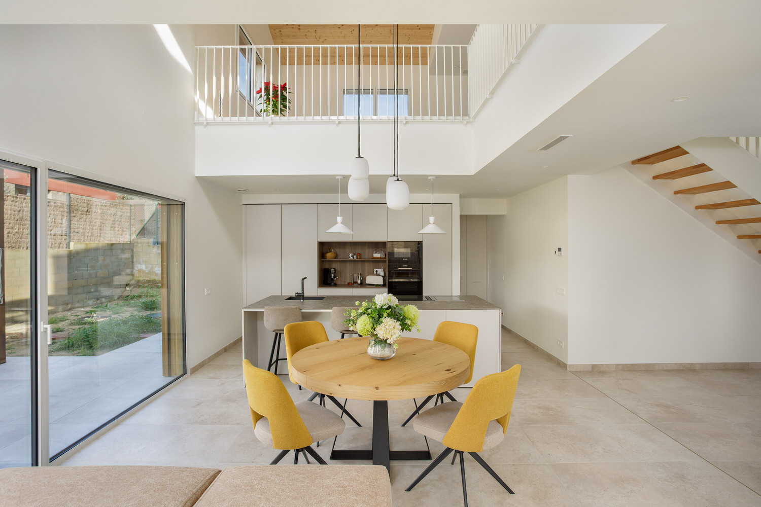 Se trata de una casa unifamiliar dentro de un pequeño pueblo con capacidad para 6 personas. Las dos alturas y la distribución de cada planta, permiten que el espacio destinado a cocina-comedor-estar tenga una gran abertura que conecta ambas alturas. Siendo este el eje central que conecta toda la casa.