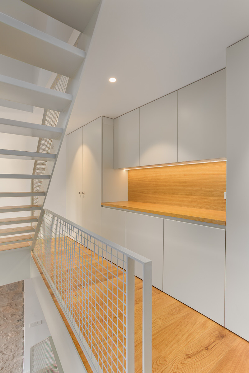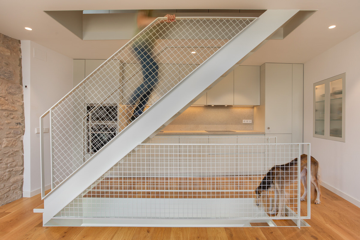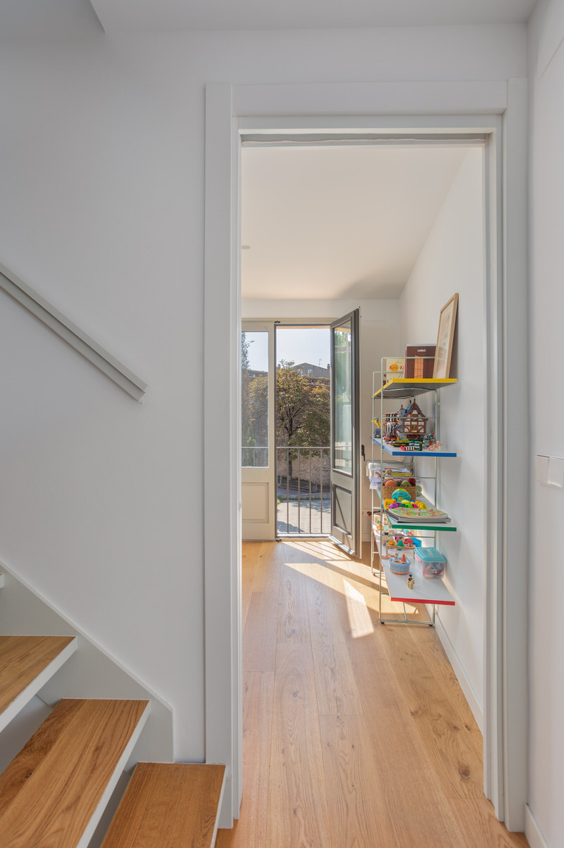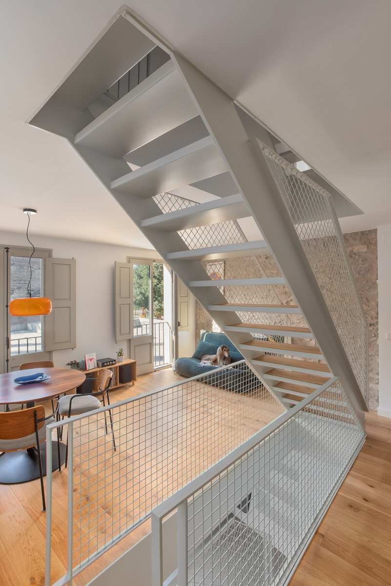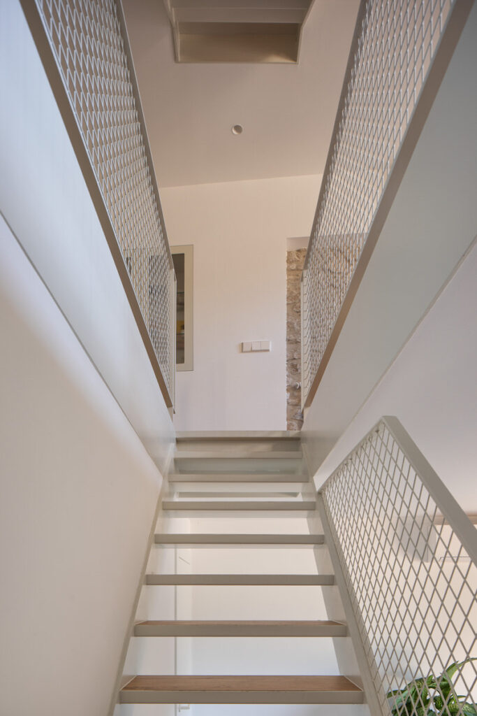 Casa Estreta es una vivienda entre medianeras que está vertebrada por la escalera central, y que conecta la planta inferior con la superior pasando por el centro de cada planta. No es una elección tomada a la ligera. Realmente esta configuración era la más óptima para sectorizar las zonas de la vivienda y no desaprovechar el espacio disponible. Por lo tanto, a la hora de realizar la producción del reportaje era inevitable destacar la escalera y sus elementos.